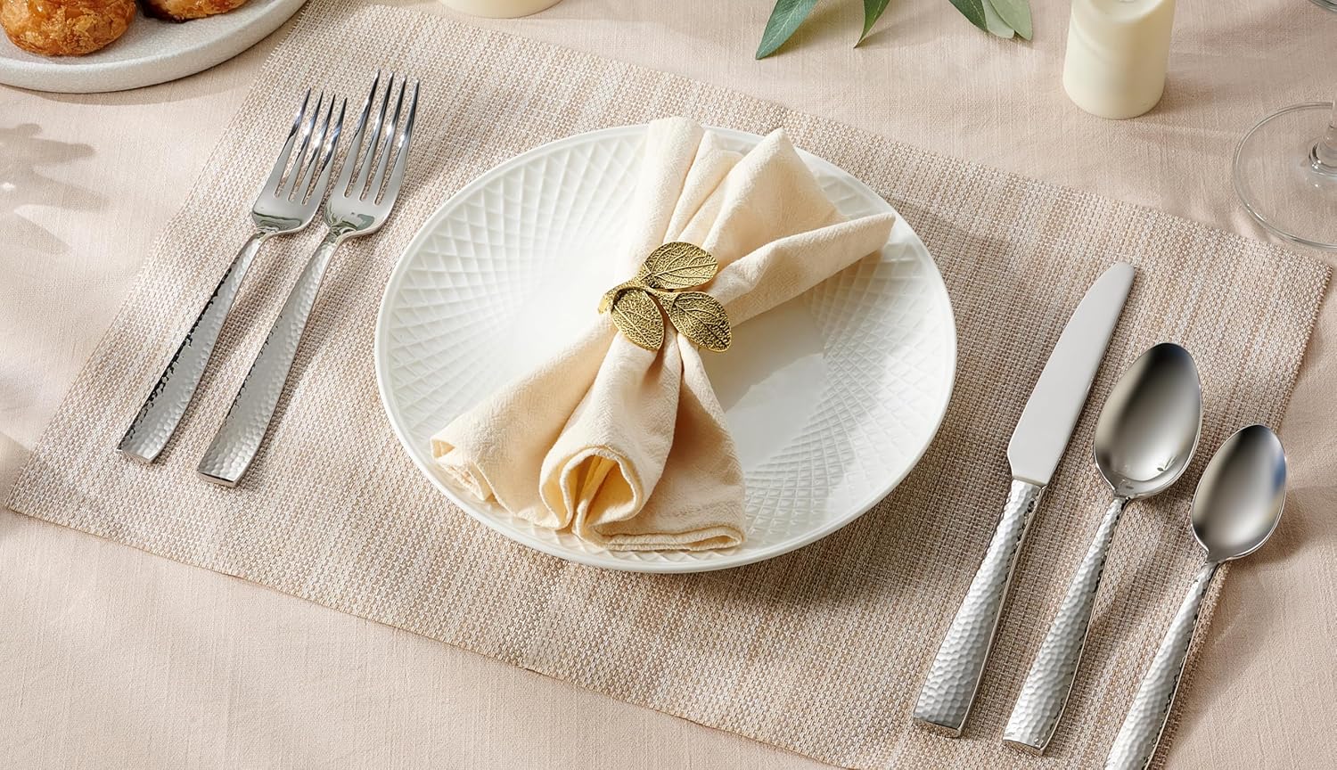 • Hammered 89-piece flatware set, service for 12: includes 12 dinner knives, 12 dinner forks, 12 salad forks, 12 dinner spoons, 24 teaspoons, 12 demitasse espresso spoons