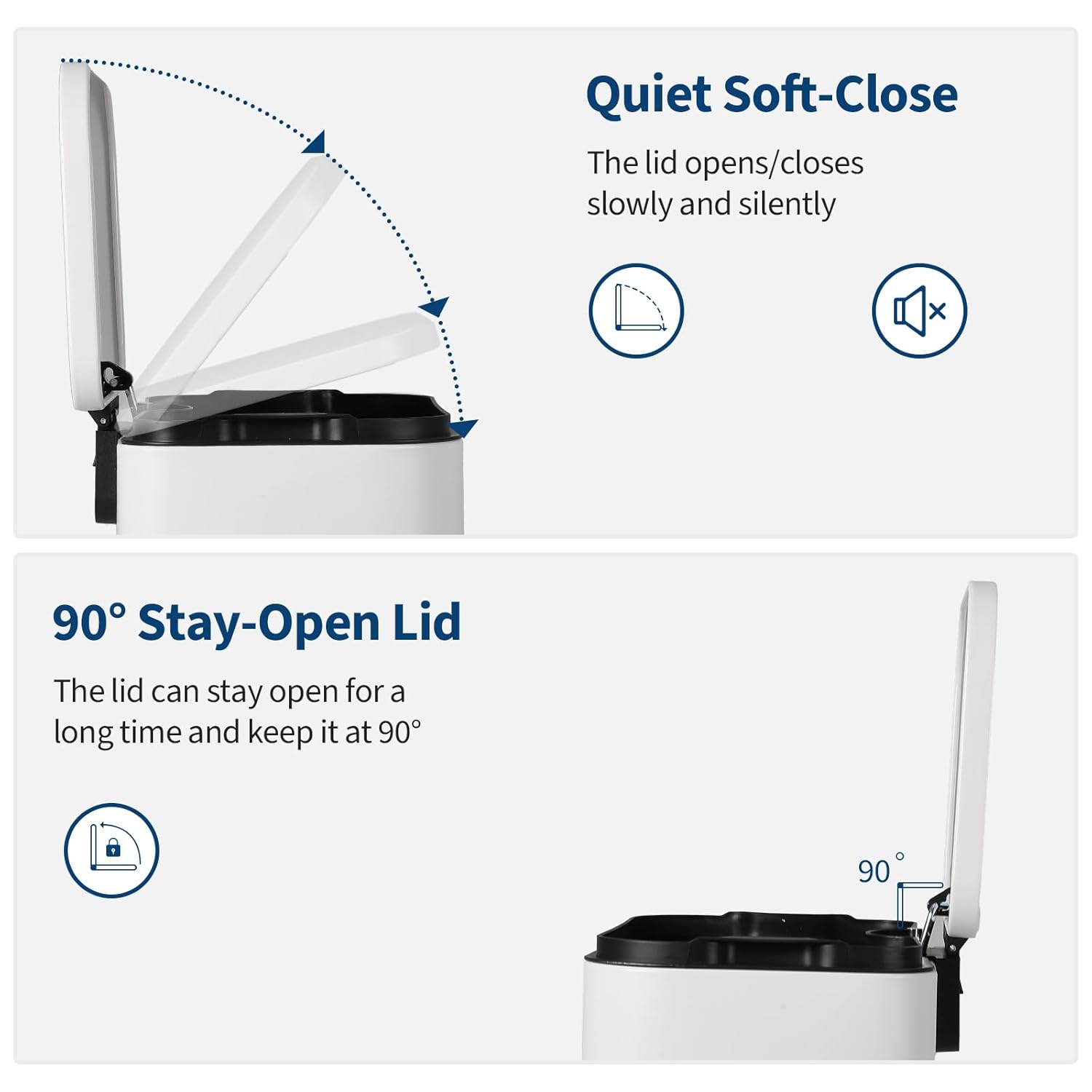 • Whisper-Quiet Soft-Close Lid: Engineered with an advanced damping system, the lid closes silently and gradually every time. No more jarring slams that startle you or disturb others—whether you're on a phone call in the office or relaxing in the living room. This thoughtful mechanism also reduces wear and tear, extending the life of your trash can while keeping your space calm and quiet