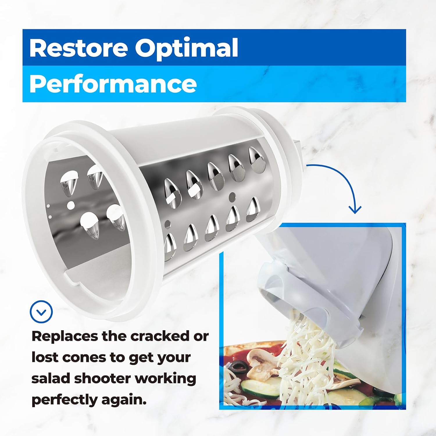 • 【RESTORE LIKE-NEW PERFORMANCE】Replace cracked or lost shredder cones to get your salad shooter working perfectly again. Value for money, just get a replacement part to restore your favorite kitchen tool without the cost of an entirely new salad shooter.