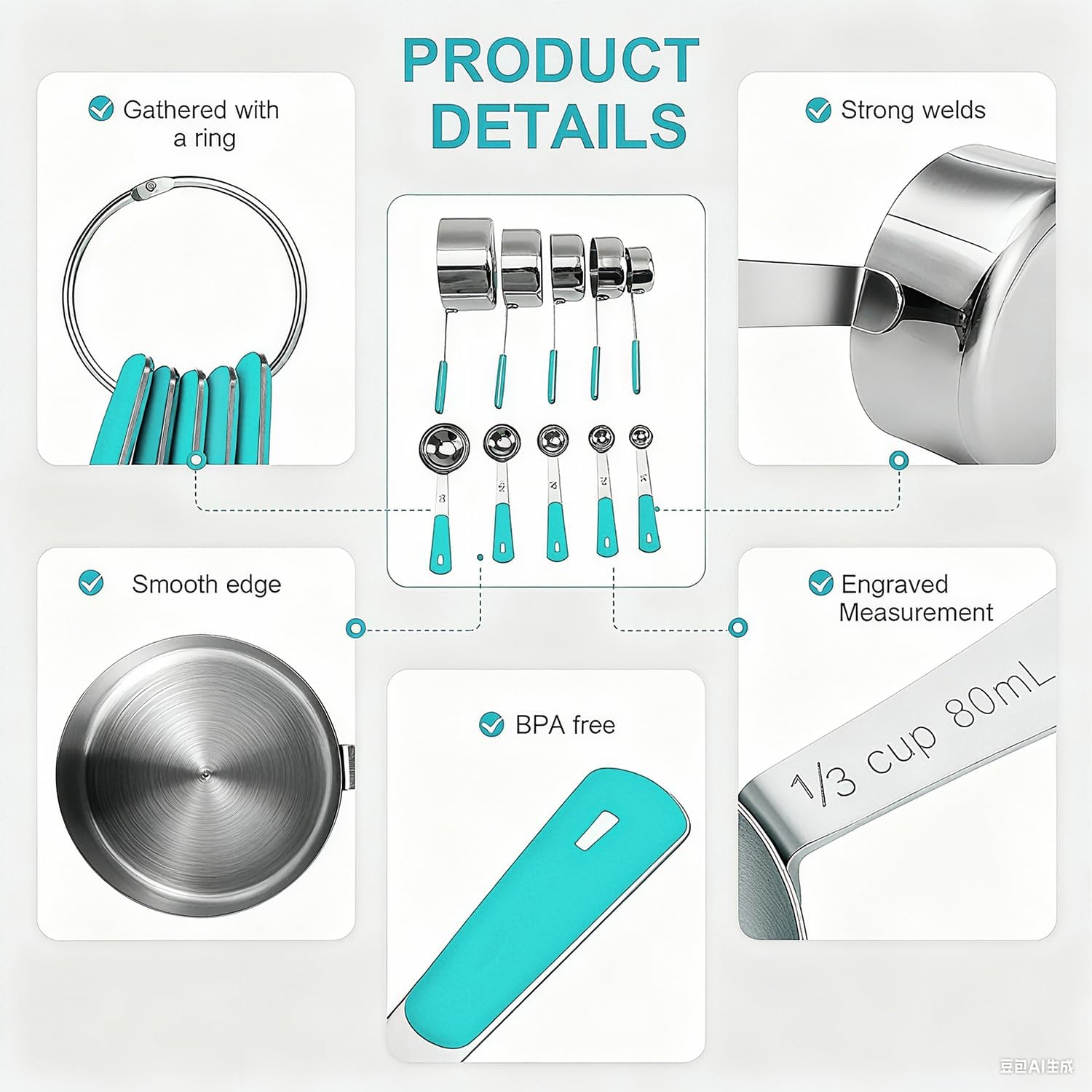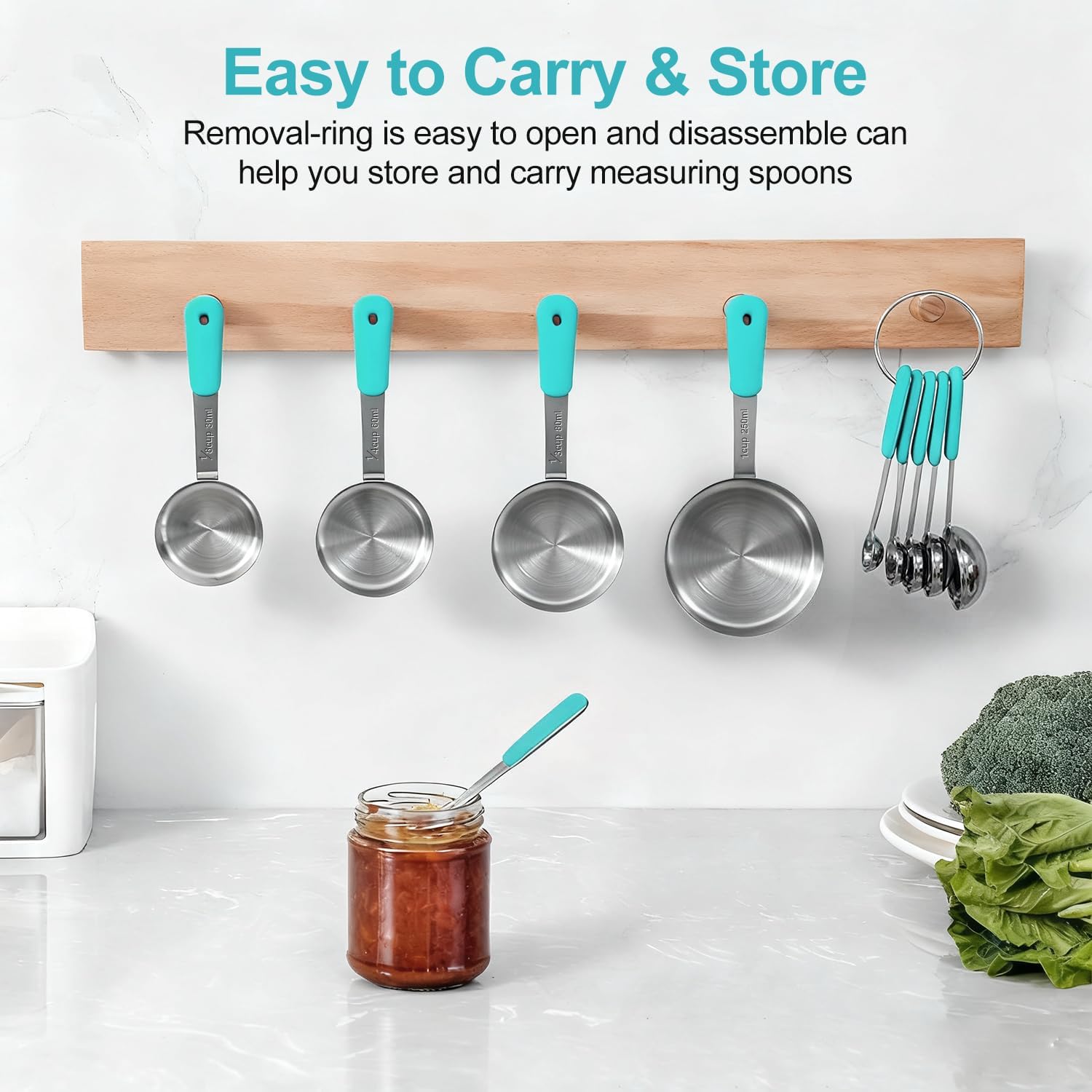 Measuring Cups and Spoons Set, Stainless Steel 10 Piece for Cooking and Baking (5 Cups + 5 Spoons, Aqua Sky Handle)