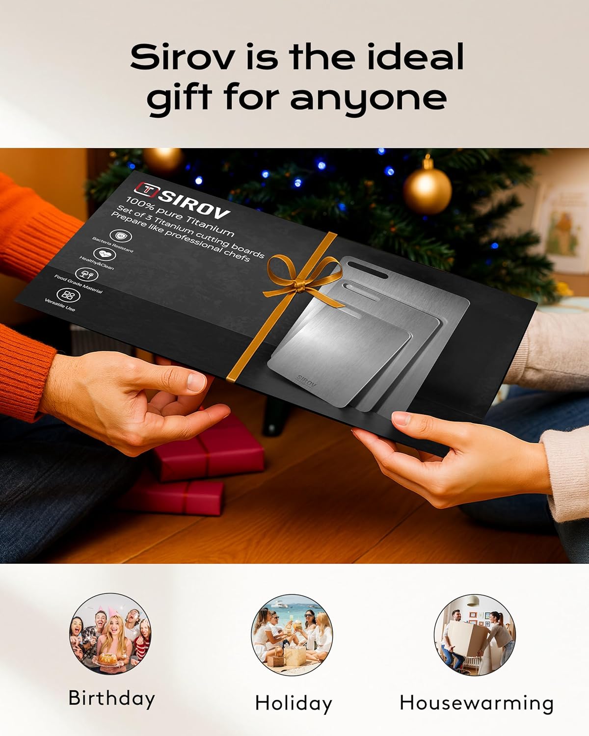 • [100% Pure Titanium Cutting Board]Sirov 3-Piece Set Sizes: 16"L x 10"W, 12.6"L x 8"W, and 10.2"L x 6.3"W.Our titanium cutting boards feature a smooth, non-porous surface that prevents food particles and liquids from accumulating, ensuring superior hygiene. Unlike wooden, plastic, glass, and stainless steel cutting boards, our titanium boards do not absorb liquids or odors, making them ideal for any kitchen.