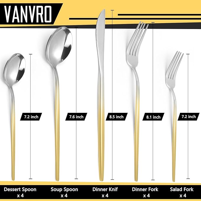 • Gradient Handle Design - New products of VANVRO classic silverware cutlery,flatware set series : Gradient gold Handle Mirror Polished Flatware Set,Add four colors to choose from.The design of fashion trends is a kind of enjoyment both visually and in dining experience.