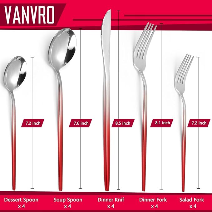 • Gradient Handle Design - New products of VANVRO classic silverware cutlery,flatware set series : Gradient gold Handle Mirror Polished Flatware Set,Add four colors to choose from.The design of fashion trends is a kind of enjoyment both visually and in dining experience.