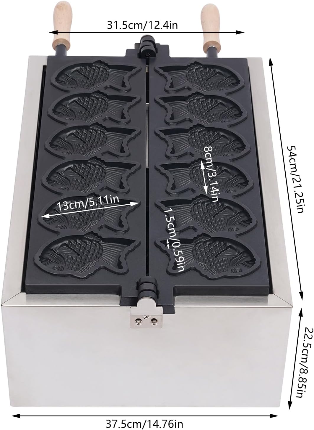 6Pcs Commercial Taiyaki Fish Waffle Maker 3000W Electric Nonstick Fish-Shaped Waffle Baker Machine for Family, Restaurants, Food Stores