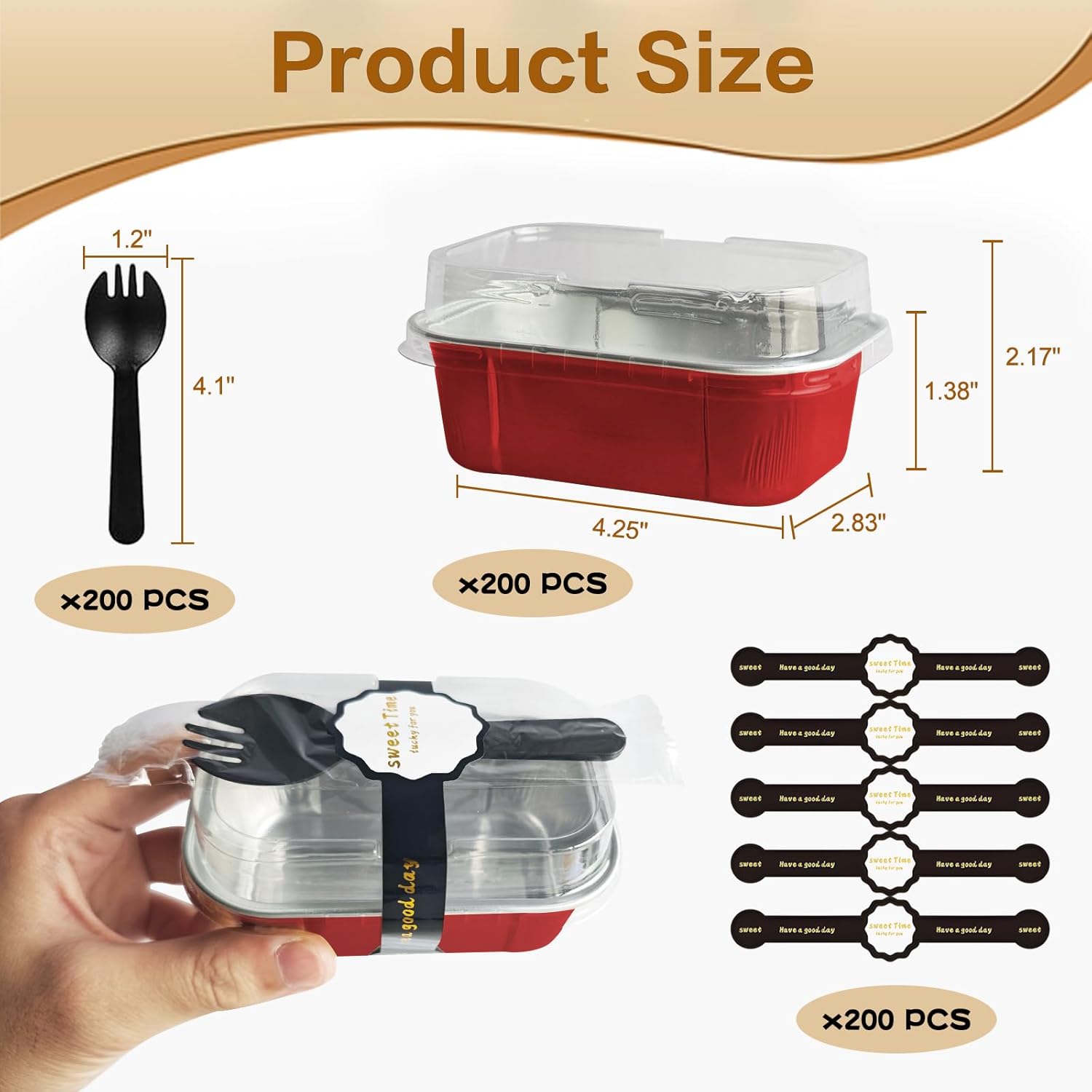 Mini Cake Pans With Lids And Spoons,5.5 oz Rectangle Mini individual Loaf Pans Disposable Aluminum Foil Small Baking Cups Tins (200, Red)