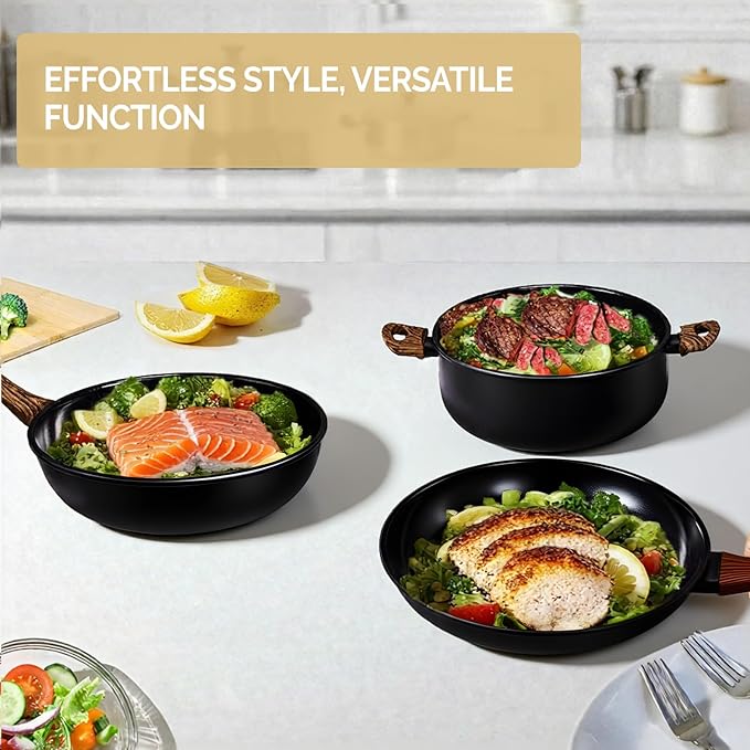 • Universal Stove Compatibility: The induction-ready cookware works seamlessly on all stovetops, including induction, gas, ceramic, and electric. Its reinforced composite base ensures rapid, even heat distribution while resisting warping. Designed for daily cooking versatility, it adapts perfectly to any kitchen setup and appliance combination for consistent performance.