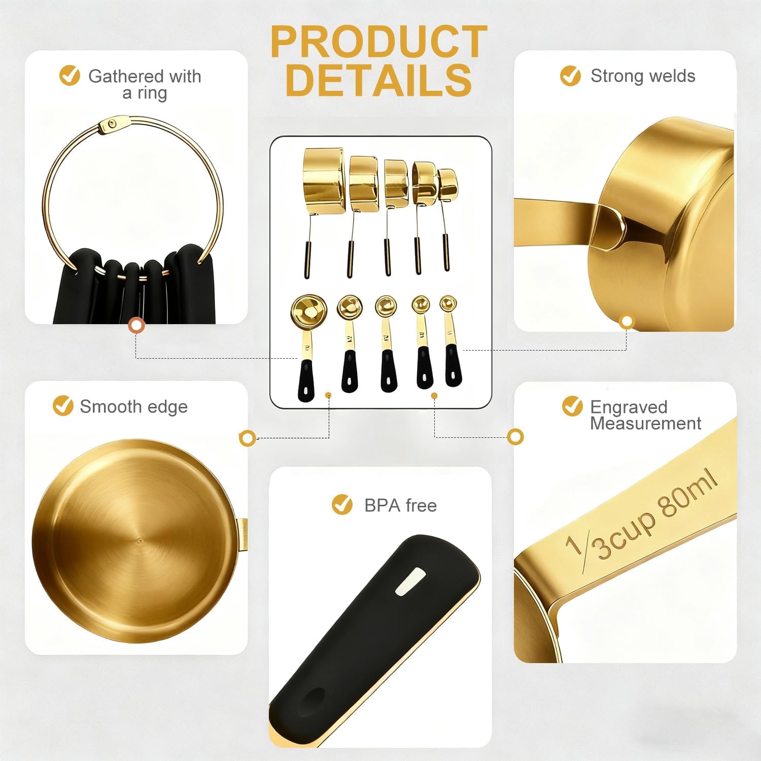 Measuring Cups and Spoons Set, Stainless Steel 10 Piece for Cooking and Baking (5 Cups + 5 Spoons, Golden)