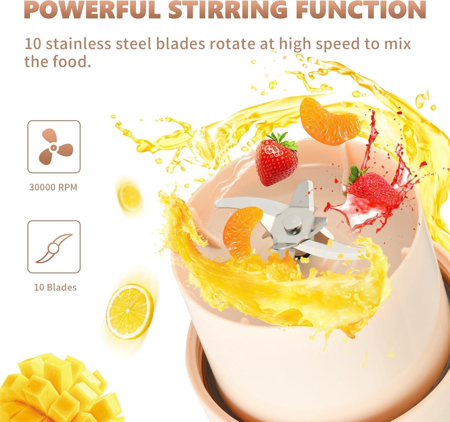 • 🍹【Powerful & Efficient】 The 10 stainless steel blades spin up to 18,000 RPM, making this mini blender ideal for fruits, veggies, and shakes. For best results, cut fruit into small pieces before blending in your smoothie cup blender.[Note] If the red light is on, the lid is not tightened. Secure the lid until the blue light appears, indicating the blender is ready to operate normally