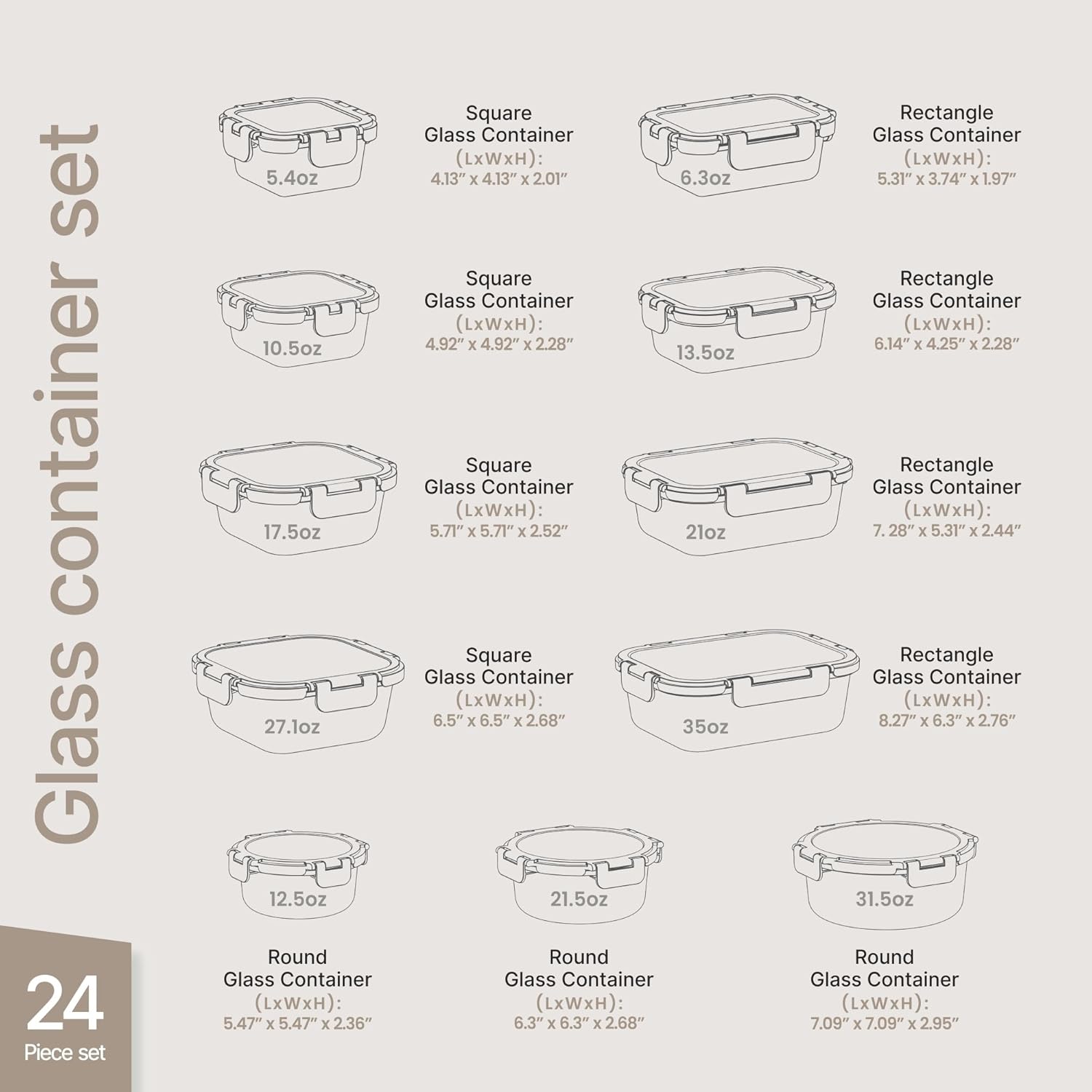 • 24-PIECE SET – This set includes 12 containers with 12 lids in multiple shapes and sizes: Round: 12.5oz x2, 21.5oz x1, 31.4oz x1, Square: 10.5oz x2, 17.8oz x1, 27oz x1, Rectangular: 13.5oz x2, 21.3oz x1, 35.2oz x1. Perfectly sized for snacks and lunches.