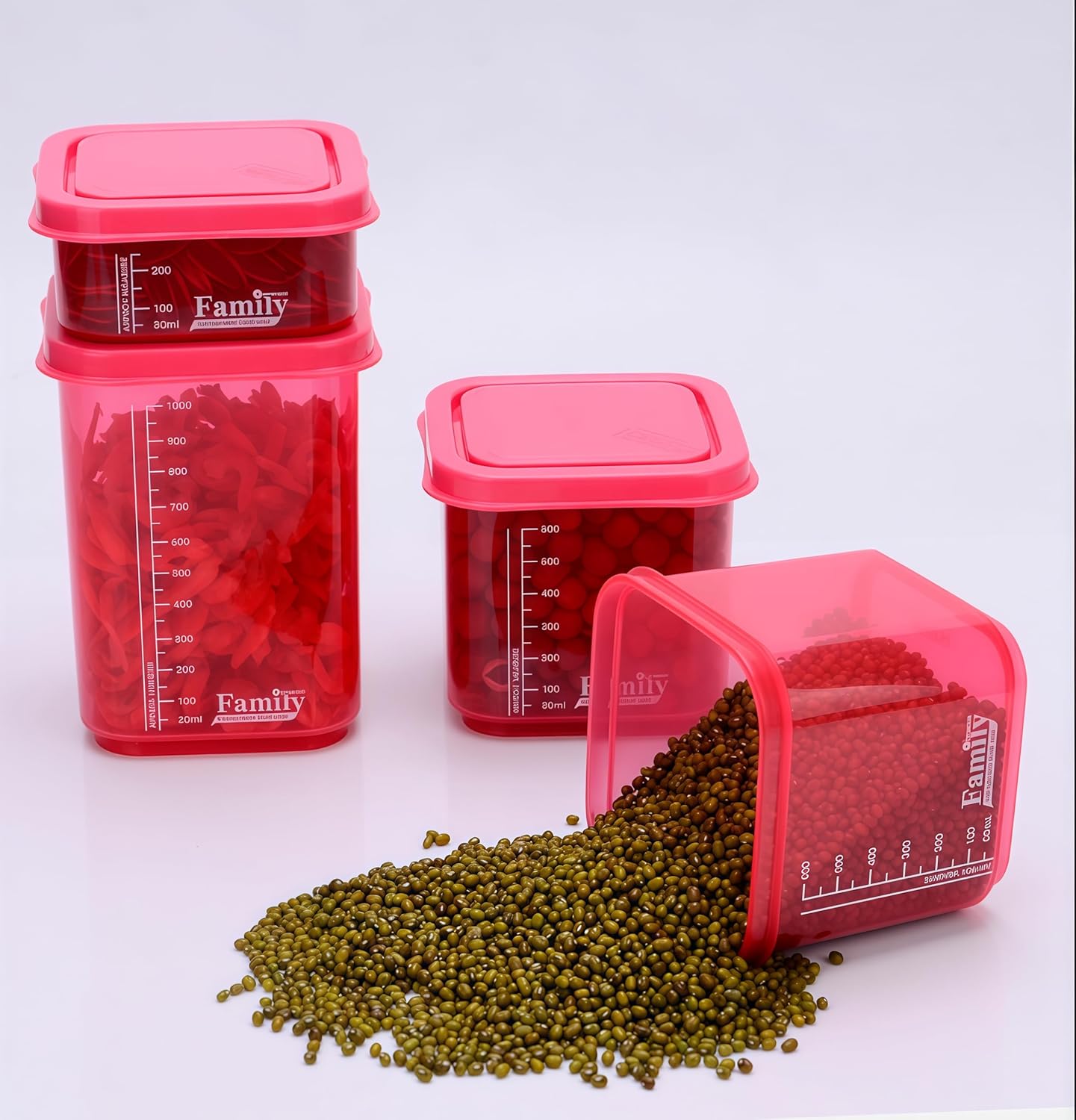 • COLORFUL SET: 4-piece set in vibrant blue, green, and pink colors helps organize different food items while adding a cheerful touch to your kitchen.Each Set includes various capacity: 300ML*1,700ML*2,and 1000ML*1 total 4pcs( if including lids will be 8pcs so).