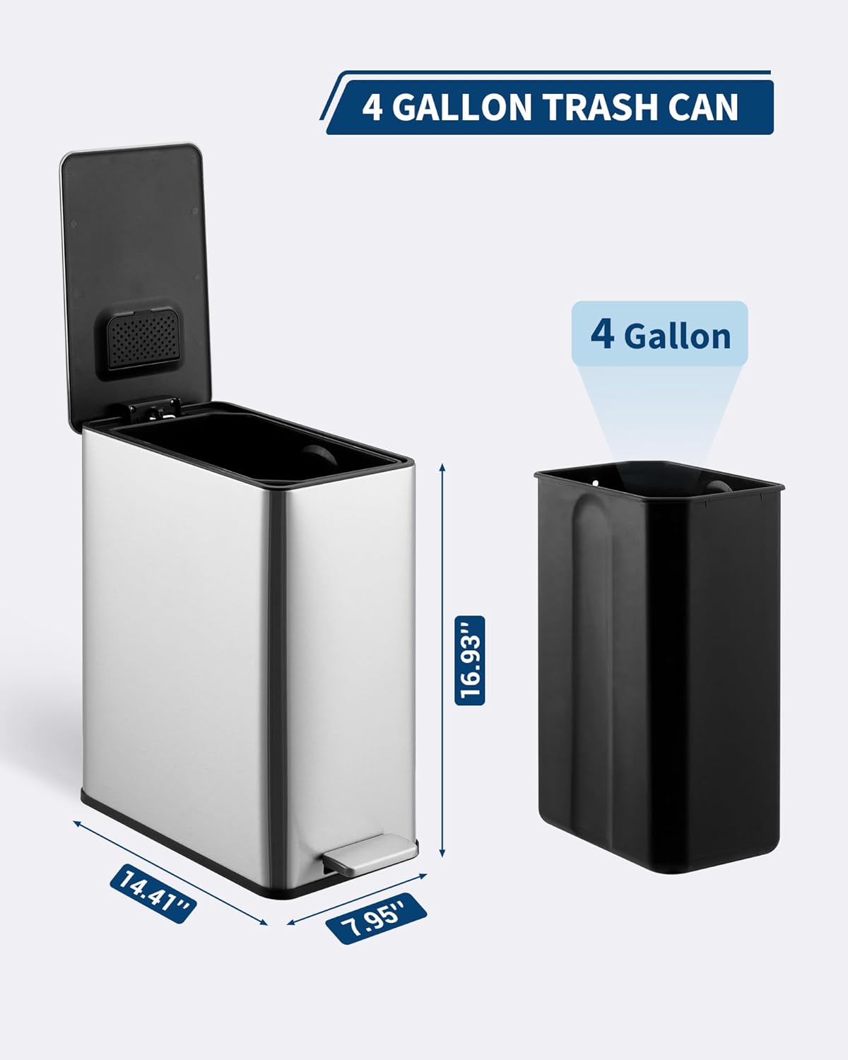 4 Gallon Stainless Steel Trash Can with Soft Close Lid, Step-on Bathroom & Kitchen Garbage Bin, Compact Slim Design with Removable Inner Bucket for Office, Living Room