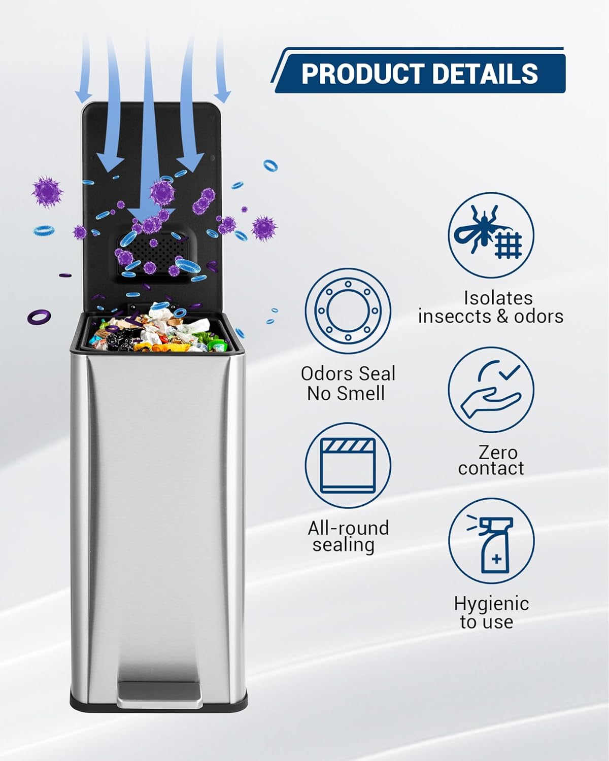 • Hands-Free, Hygienic Step-On Pedal Engineered for convenience and cleanliness. The durable foot pedal allows for completely hands-free operation, keeping germs at bay. It's the perfect step trash can for busy kitchens or when your hands are full.