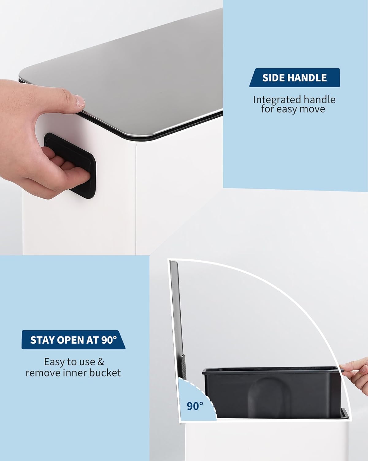• Removable Inner Bucket for Effortless Cleaning Featuring a smooth, removable inner bucket, emptying and cleaning this stainless steel garbage can is a breeze. It simplifies waste separation and recycling, ensuring a more hygienic and manageable experience in any room.