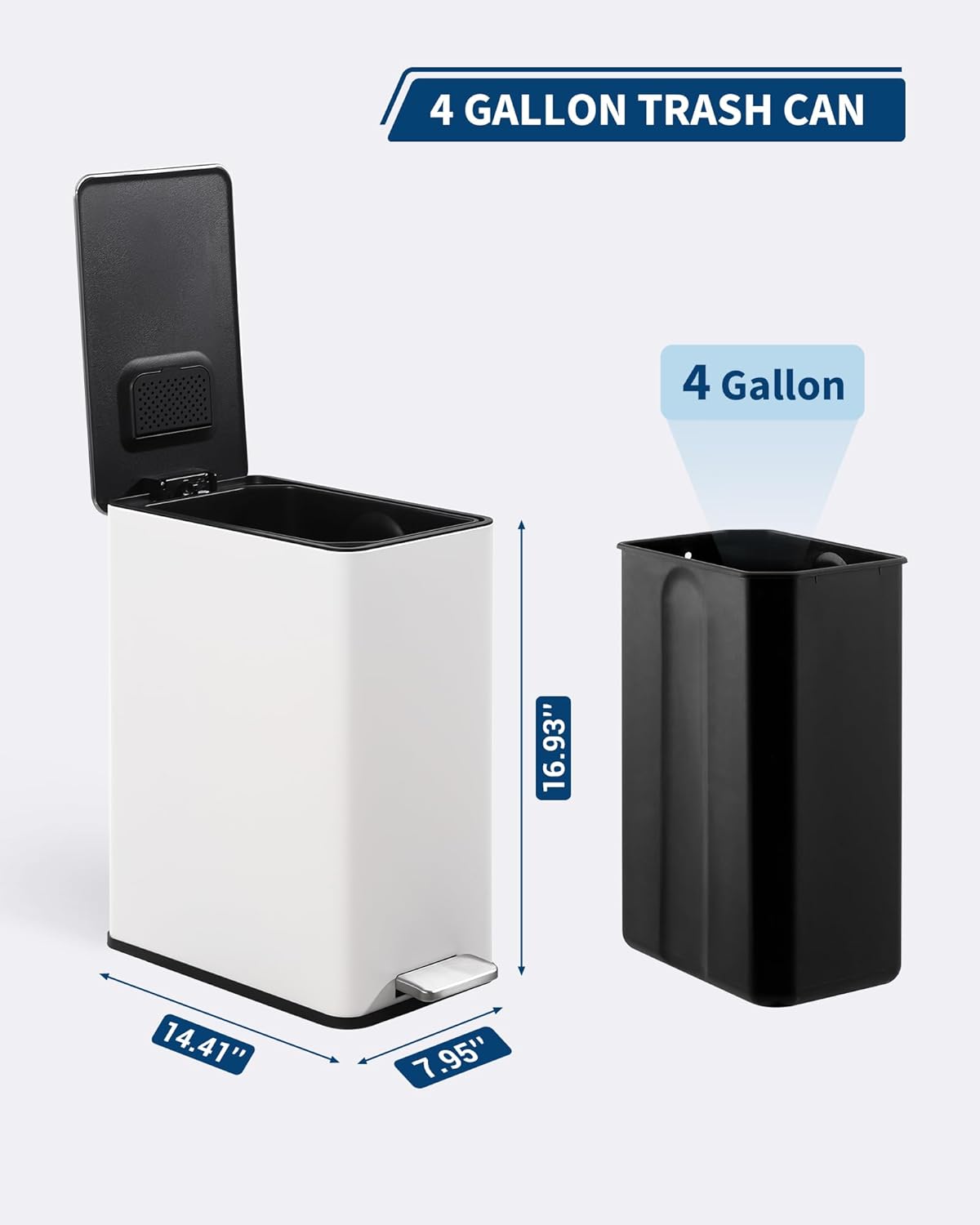 • Space-Saving Design, Ample 4-Gallon Capacity This slim trash can is expertly designed to tuck into tight corners, making it the perfect bathroom trash can or kitchen bin. Despite its compact footprint, it smartly holds 4 gallons/15L of daily waste, ideal for small apartments, offices, and dorm rooms.