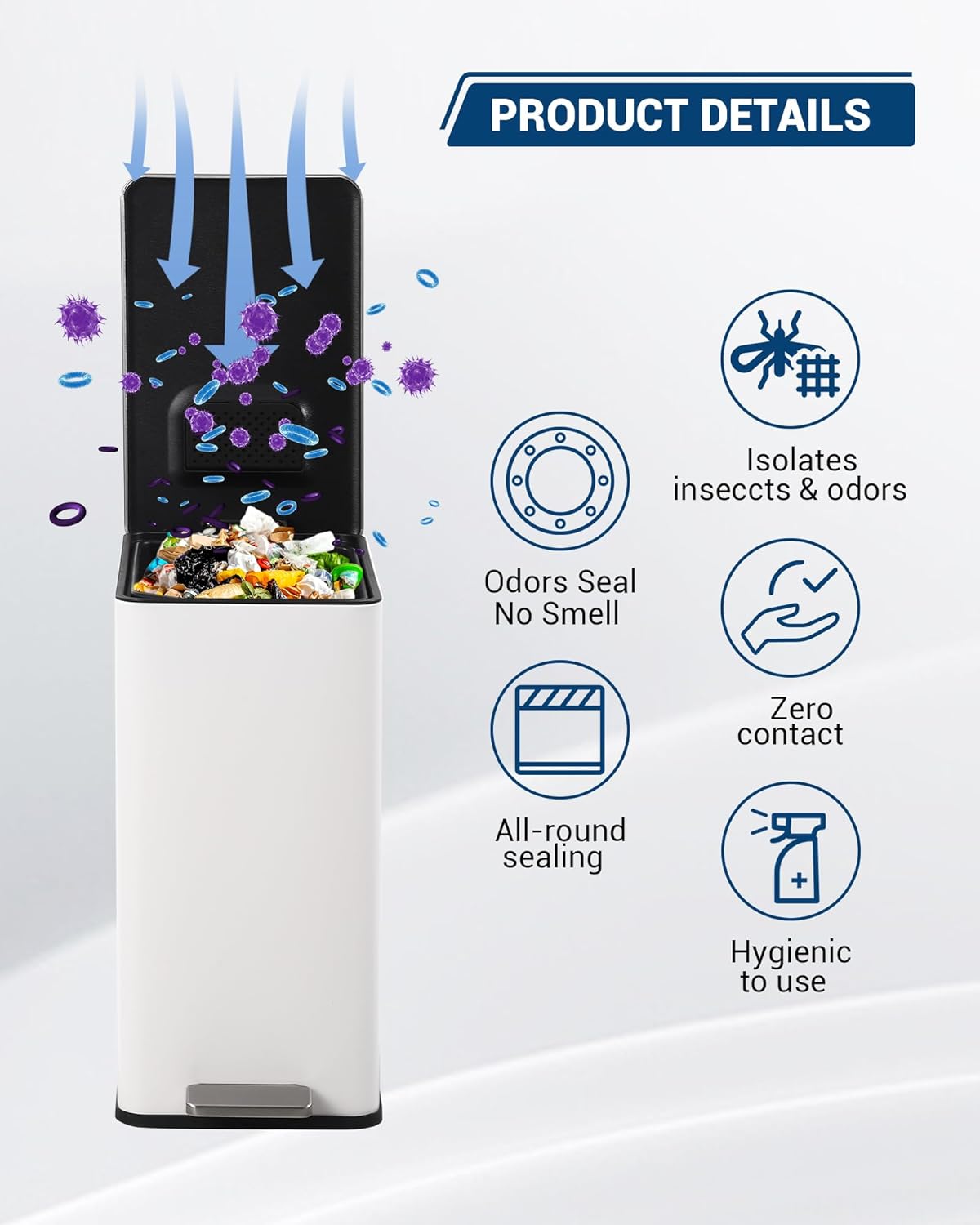 • Hands-Free, Hygienic Step-On Pedal Engineered for convenience and cleanliness. The durable foot pedal allows for completely hands-free operation, keeping germs at bay. It's the perfect step trash can for busy kitchens or when your hands are full.