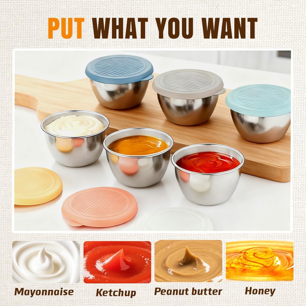 • 【Colorful Lids】: The colorful silicone lids set can meet the various preferences, and can also be used to distinguish the different sauces in the container.Our bright playful color let you sauces at a glance guessing which cup holds different sauces—reducing kitchen clutter. These functional condiment cups add a pop of color to lunch boxes.