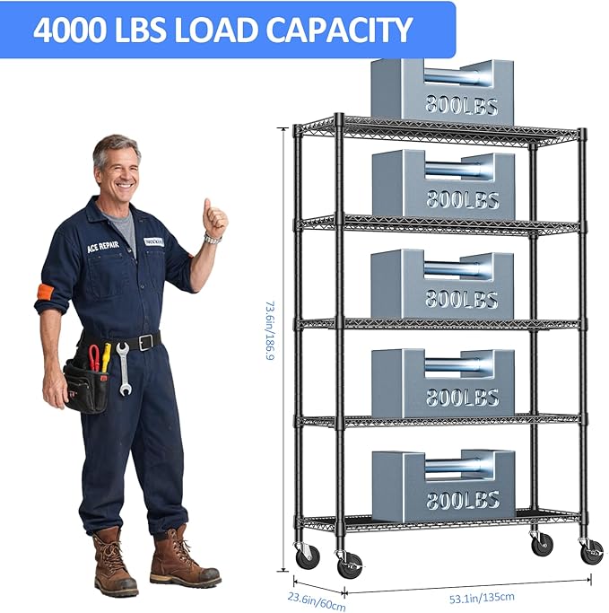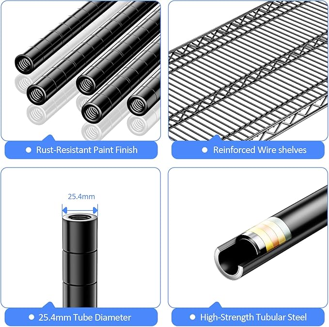 • COMMERCIAL-GRADE HEAVY DUTY – Made from high-quality carbon steel with 25.4mm reinforced rods, this heavy duty garage shelving supports up to 660 lbs per shelf and 2640 lbs total on leveling feet (approx. 530 lbs on wheels).